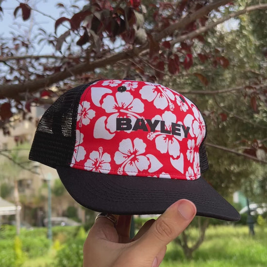This vibrant trucker cap features a bold red and white Hawaiian hibiscus floral pattern on the front panel, paired with the “BAYLEY” logo in sleek black lettering. The black mesh back ensures breathability, while the curved black brim provides sun protection and a stylish contrast. A perfect accessory for summer vibes, casual outings, or anyone who loves a tropical-inspired look.