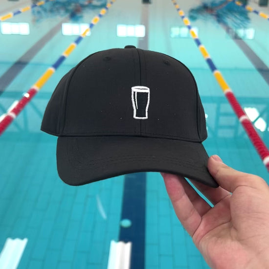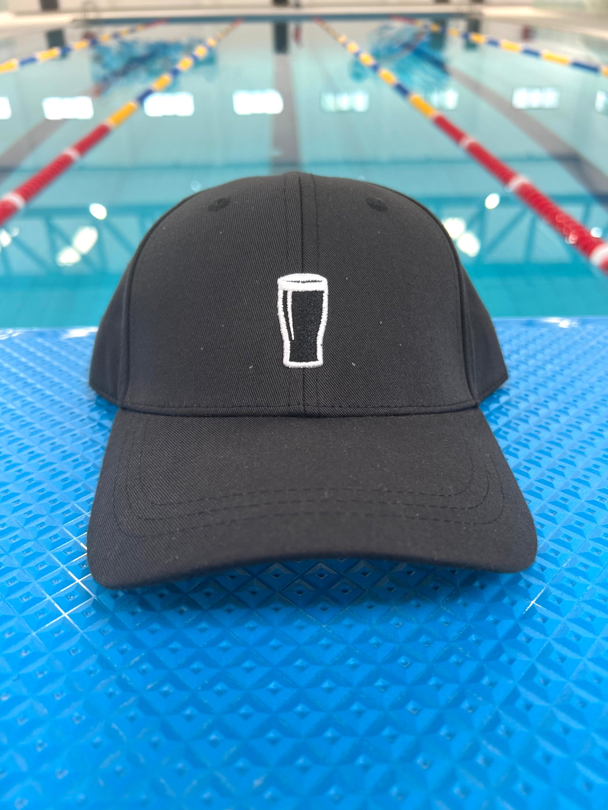 A sleek black baseball cap featuring a minimalist white embroidered pint glass icon centered on the front. The simple, clean design makes it versatile for casual wear, especially appealing to beer enthusiasts and fans of understated style.