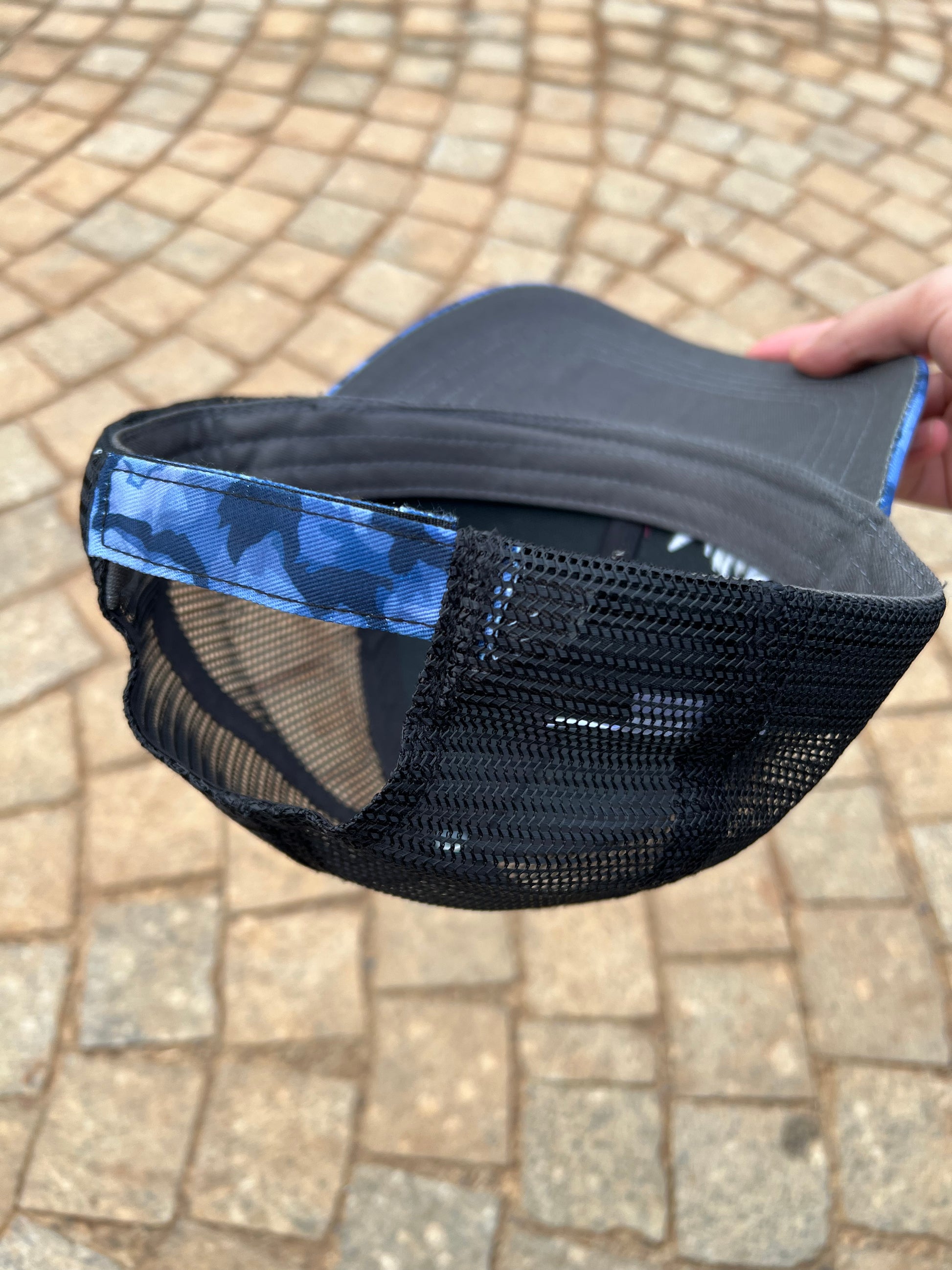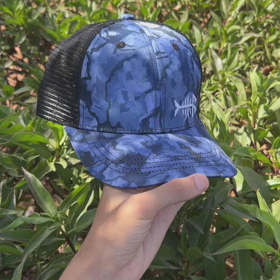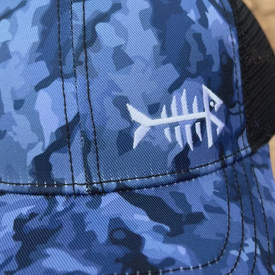 Bold blue camouflage trucker cap featuring a white embroidered fishbone emblem on the front. Designed with breathable black mesh panels for comfort, this cap blends rugged outdoor style with a touch of coastal, fishing-inspired flair.