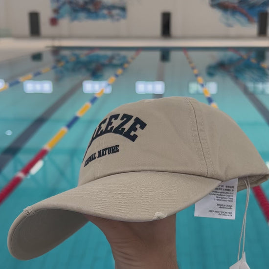 Light beige baseball cap featuring bold navy blue embroidered text reading “BREEZE” in an arched style, with smaller lettering below that says “CASUAL NATURE.” Designed with a curved brim and breathable eyelets, this cap blends a relaxed aesthetic with durable cotton construction for everyday casual wear.