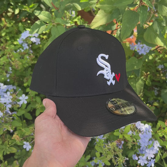 Stylish black adjustable cap featuring the iconic white “Sox” logo embroidered on the front, accented with a small red heart for a unique and playful twist. Perfect for baseball fans and streetwear lovers alike.