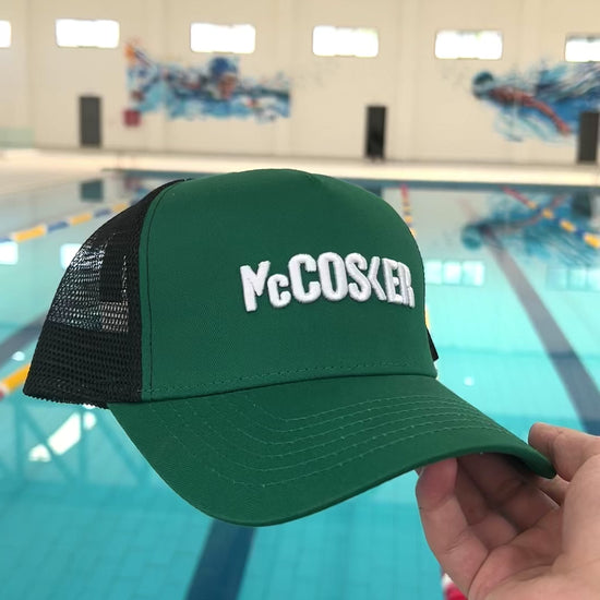 A vibrant green trucker cap with a curved brim and breathable black mesh back panels. The front features bold white embroidered “McCOSKER” lettering, adding a clean and professional touch. Perfect for casual wear, outdoor activities, or as a branded accessory for promotional events.
