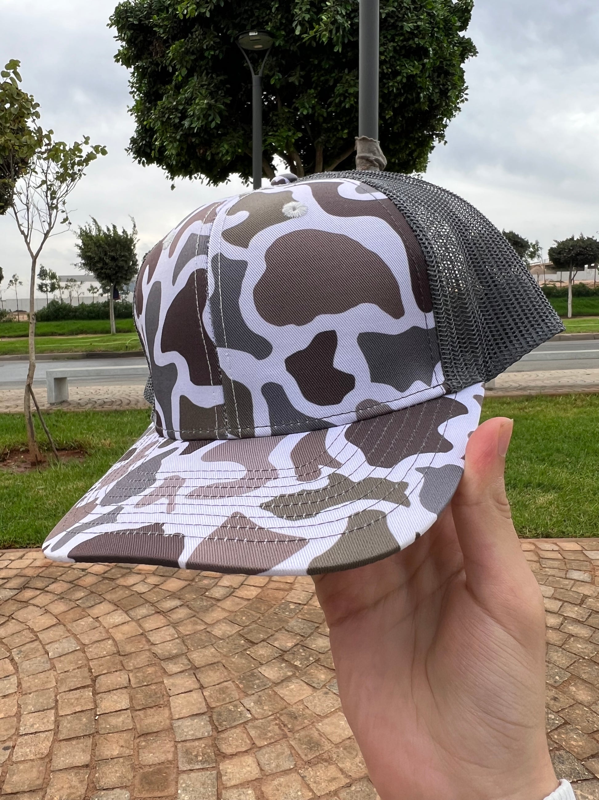 Blend rugged style with modern comfort in the Grey Camo Mesh Trucker Cap — designed for those who live life on the move. Featuring a bold grey, white, and brown camouflage pattern, this cap delivers a fresh urban edge with an outdoorsy twist. The breathable mesh back keeps you cool in any setting, while the curved brim and adjustable snapback closure ensure a perfect everyday fit.