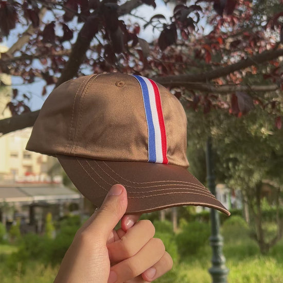 The Heritage Stripe Cap combines classic design with a touch of bold style. Its earthy brown base is elevated by a striking vertical stripe in red, white, and blue—adding a sporty yet timeless edge. Comfortable and versatile, this cap is perfect for casual wear, outdoor activities, or completing a laid-back urban look.