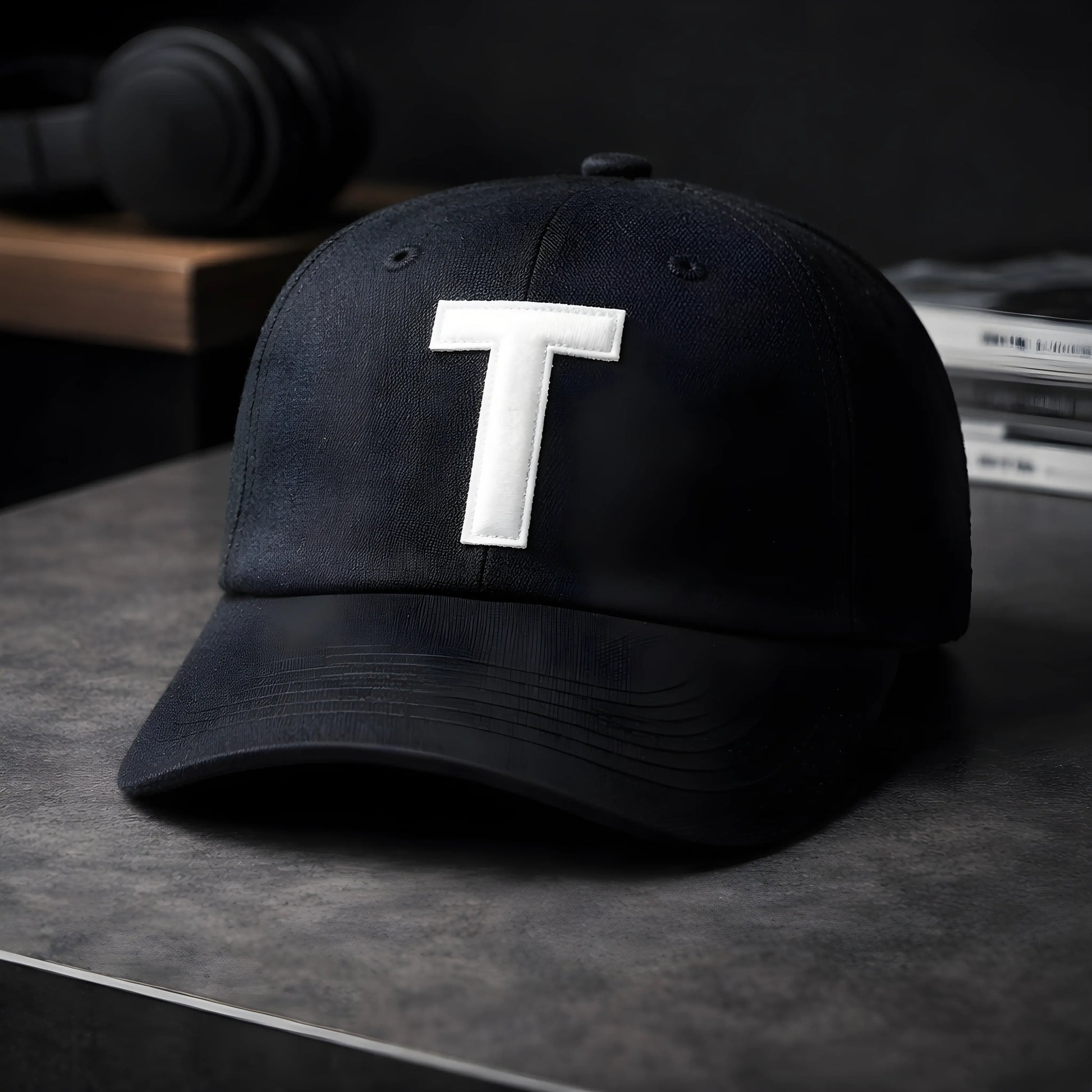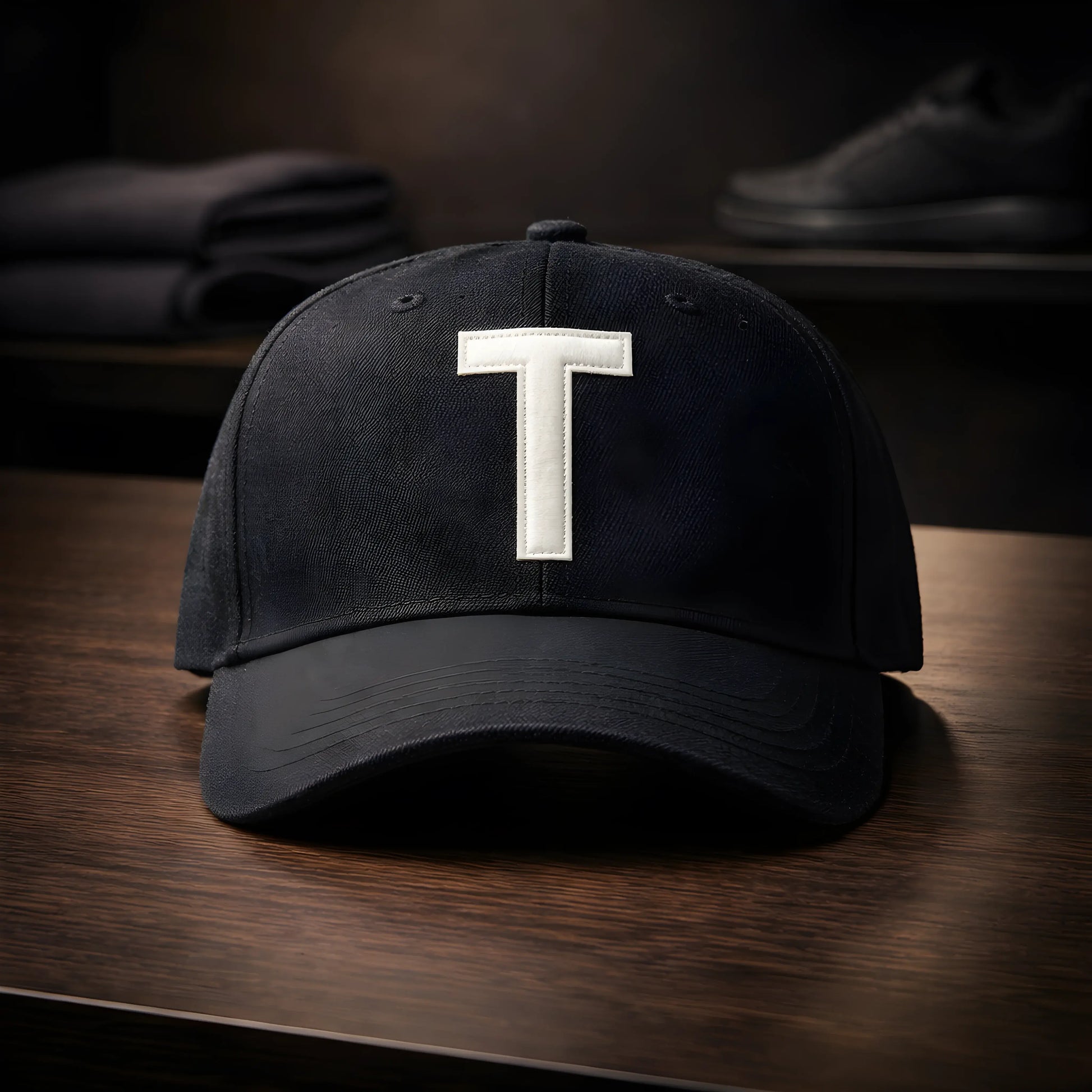 Add a timeless touch to your casual style with the Heritage "T" Monogram Cap. Crafted in a classic deep navy blue, this structured baseball hat features a bold, white embroidered "T" in a traditional block font at the center of the crown. Designed with a comfortable fit and a classic curved brim, this minimalist cap is a versatile accessory perfect for everyday wear.