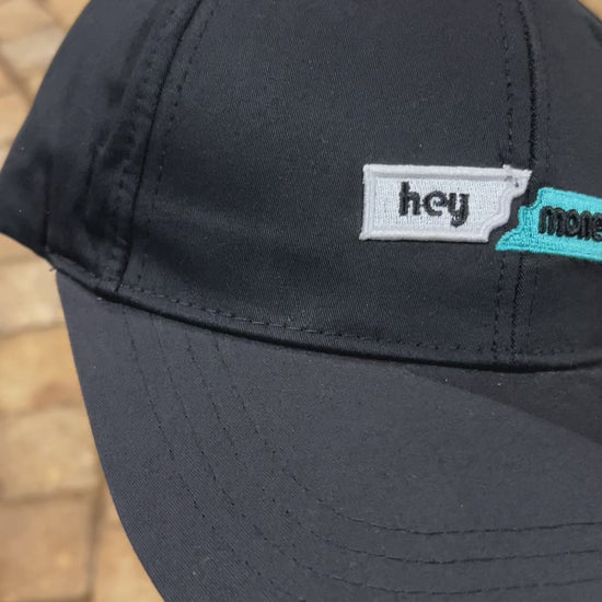 This is a stylish black baseball cap featuring an embroidered patch design on the front. The patch displays the phrase "hey money" in contrasting white and turquoise colors, giving the cap a trendy and modern look. Made from durable fabric, it offers both comfort and a casual streetwear vibe, perfect for everyday wear.