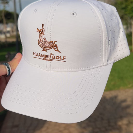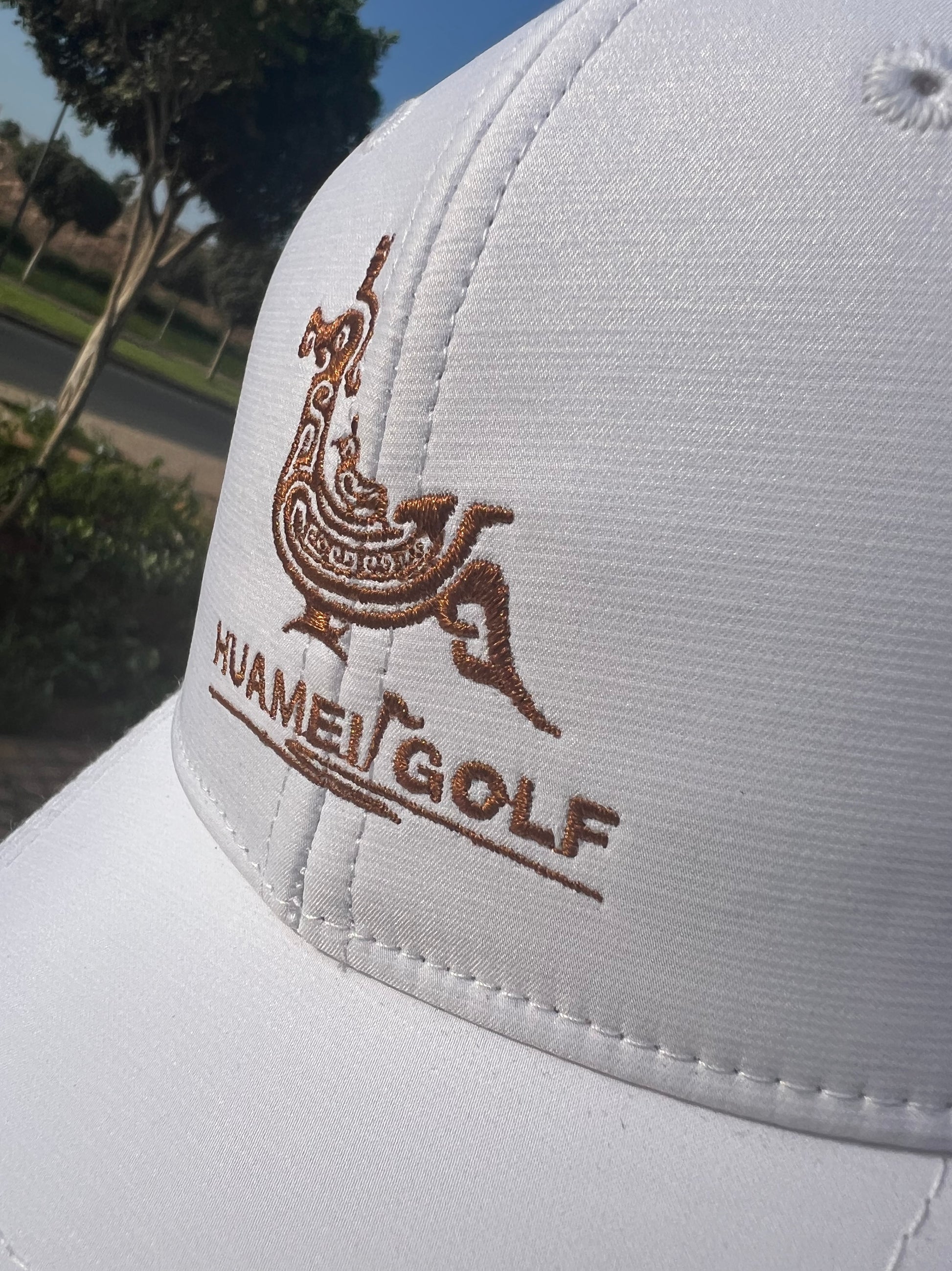 Elevate your golf style with the Huamei Elite Golf Cap, designed for performance and sophistication. Crafted from lightweight, breathable fabric, it keeps you cool and comfortable on and off the course. The clean white design, accented by a detailed brown embroidered logo, adds a refined touch to your sporty look. Adjustable for a perfect fit, this cap is your ideal companion for sunny days and active lifestyles.