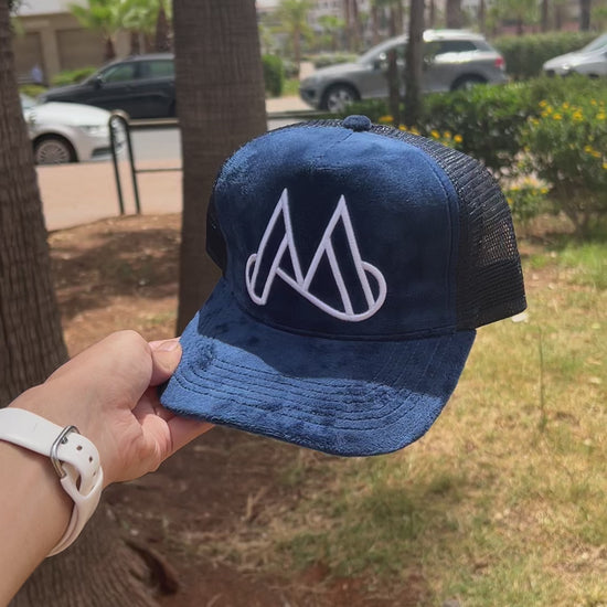 This stylish and modern trucker cap stands out with its deep navy blue velvet front panel and a bold white embroidered abstract "M" logo at the center. The texture of the velvet gives it a soft, luxurious appearance, while the black mesh back provides breathability and comfort—perfect for both fashion and function. The cap has a curved brim and an adjustable snapback closure, making it suitable for a wide range of head sizes.