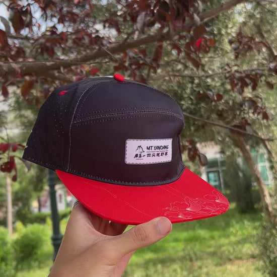 This stylish cap combines a sleek black crown with a bright red flat visor, featuring subtle mountain line art on the brim. The front patch displays “MT. YANDANG” along with Chinese characters, giving it a rugged and adventurous look inspired by outdoor landscapes. The red top button adds a bold accent, making it perfect for hiking enthusiasts or streetwear fans who love a unique cap with a travel vibe.