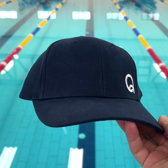 A clean and stylish navy blue baseball cap featuring a small, white embroidered “Q” logo on the front left panel. The minimalist design adds a modern and versatile touch, making it suitable for casual wear or brand representation. Crafted from durable fabric with a curved brim for a comfortable fit, it blends simplicity with subtle branding.