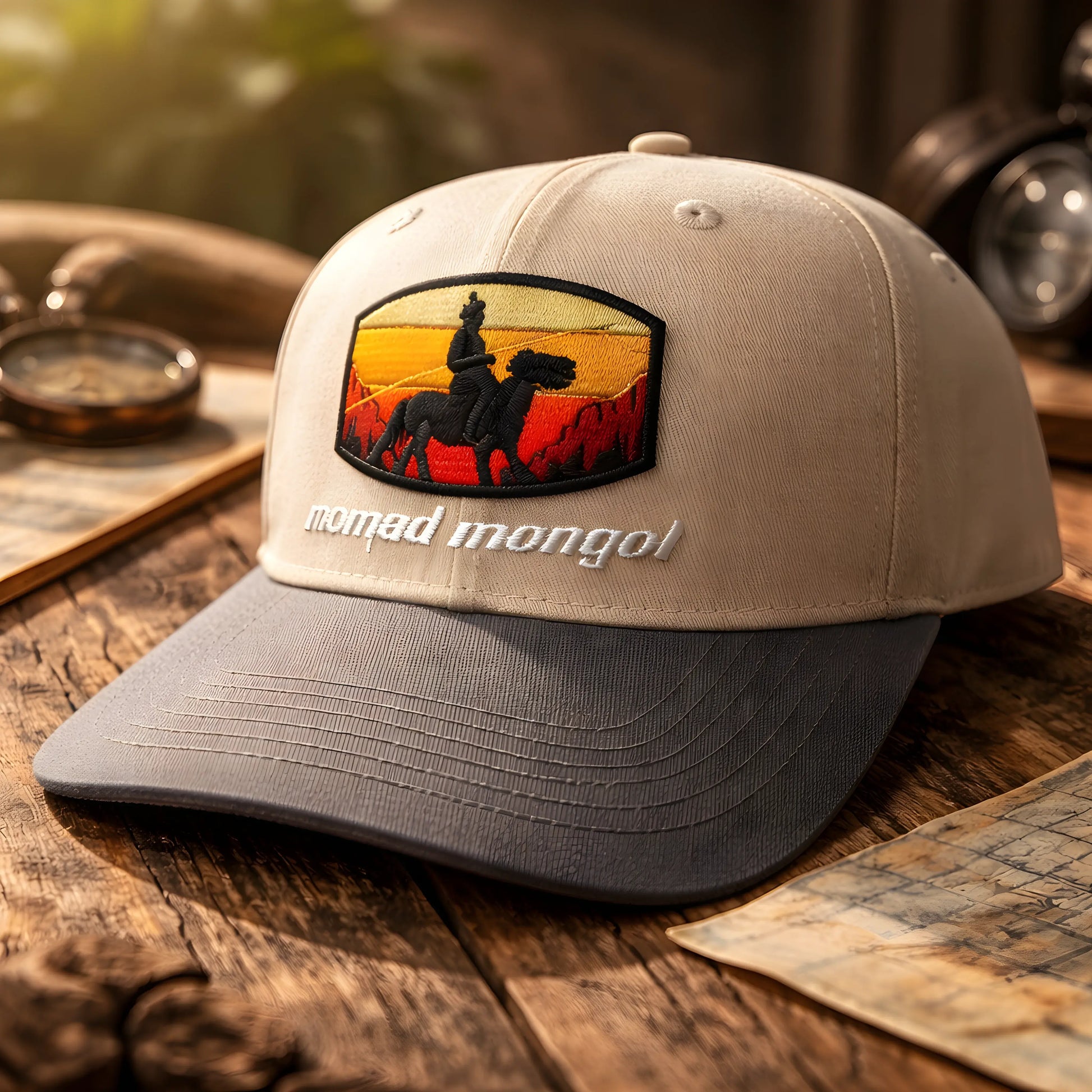 Embrace an outdoor-ready look with this stylish two-tone cap featuring a beige crown and a contrasting grey curved visor. The front showcases a bold embroidered patch of a rider at sunset with “nomad mongol” lettering, giving it a rugged travel-inspired vibe. Designed with a structured fit and comfortable feel, it’s perfect for daily wear, road trips, hiking, and casual street style. Adjustable back closure ensures a secure and comfortable fit all day long.