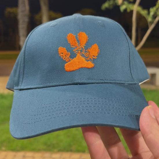 A sleek teal baseball cap featuring an embroidered orange paw print design on the front. Crafted from durable and breathable fabric, it offers a comfortable fit with an adjustable strap at the back. This cap is perfect for animal lovers or anyone looking to add a bold, playful touch to their casual style.