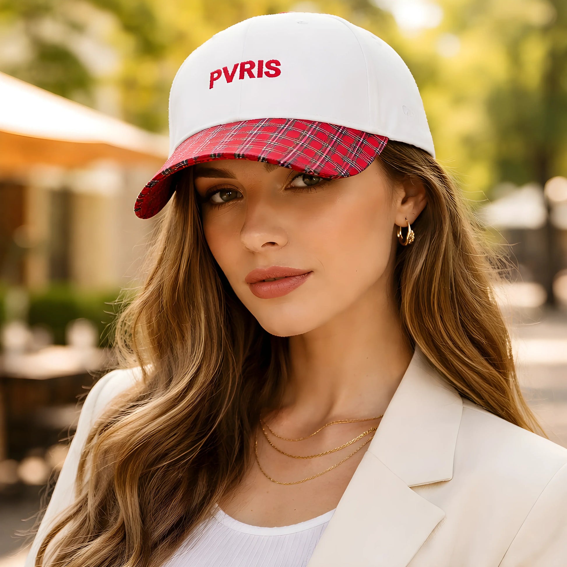 Bring a unique twist to your everyday style with this white baseball cap featuring bold red “PVRIS” embroidery and a standout red plaid curved visor. The clean structured crown keeps the look modern, while the patterned brim adds a fresh streetwear vibe that makes it easy to style with casual outfits. Lightweight and comfortable for daily wear, this cap is perfect for outings, travel, and adding a pop of personality to your look. Adjustable back closure ensures a secure and comfortable fit.