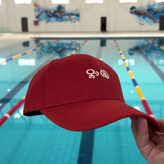 Vibrant red baseball cap featuring two distinctive white embroidered symbols on the front panel. Designed with a curved brim and structured crown, this bold and stylish accessory combines a striking color palette with clean, minimalist embroidery for a standout look.