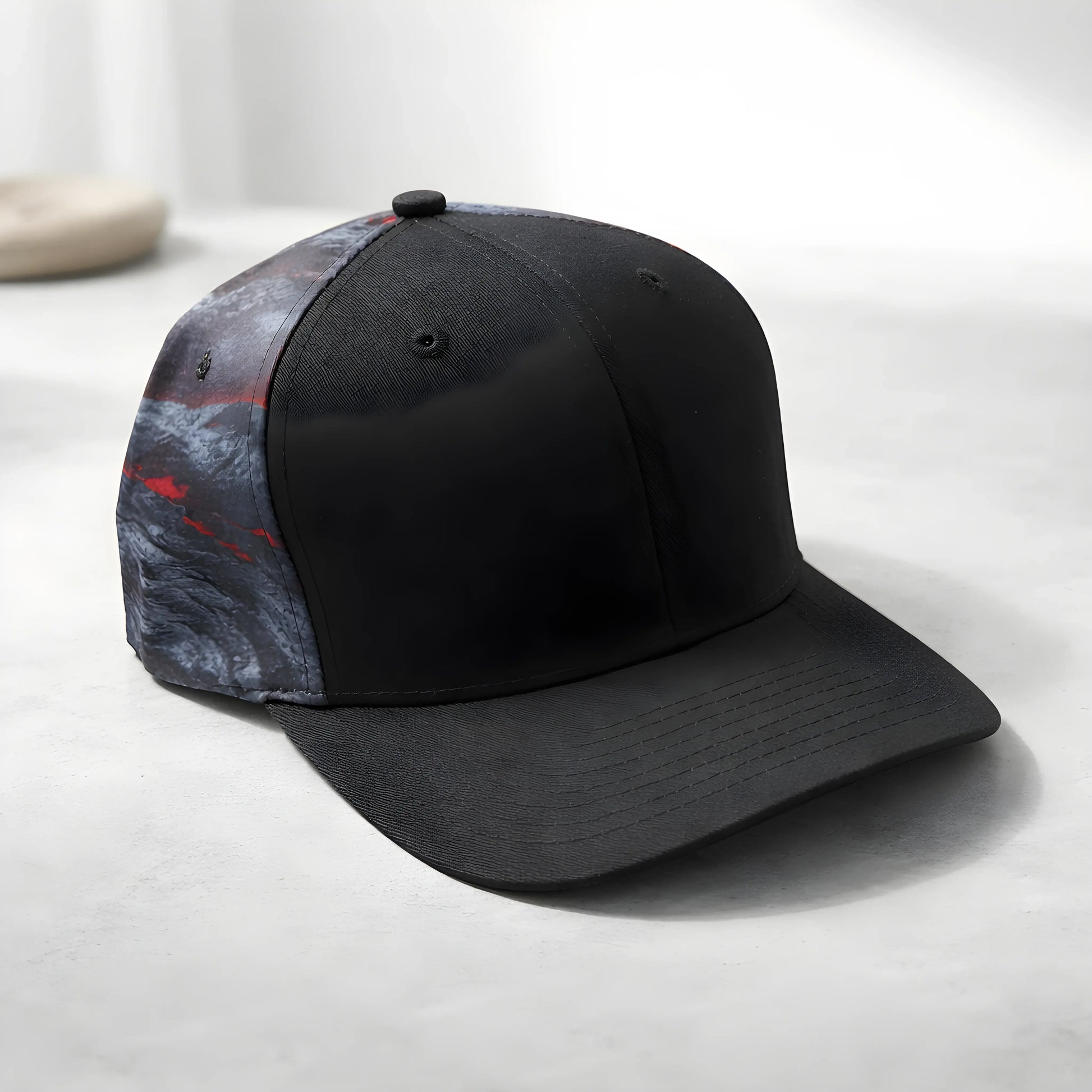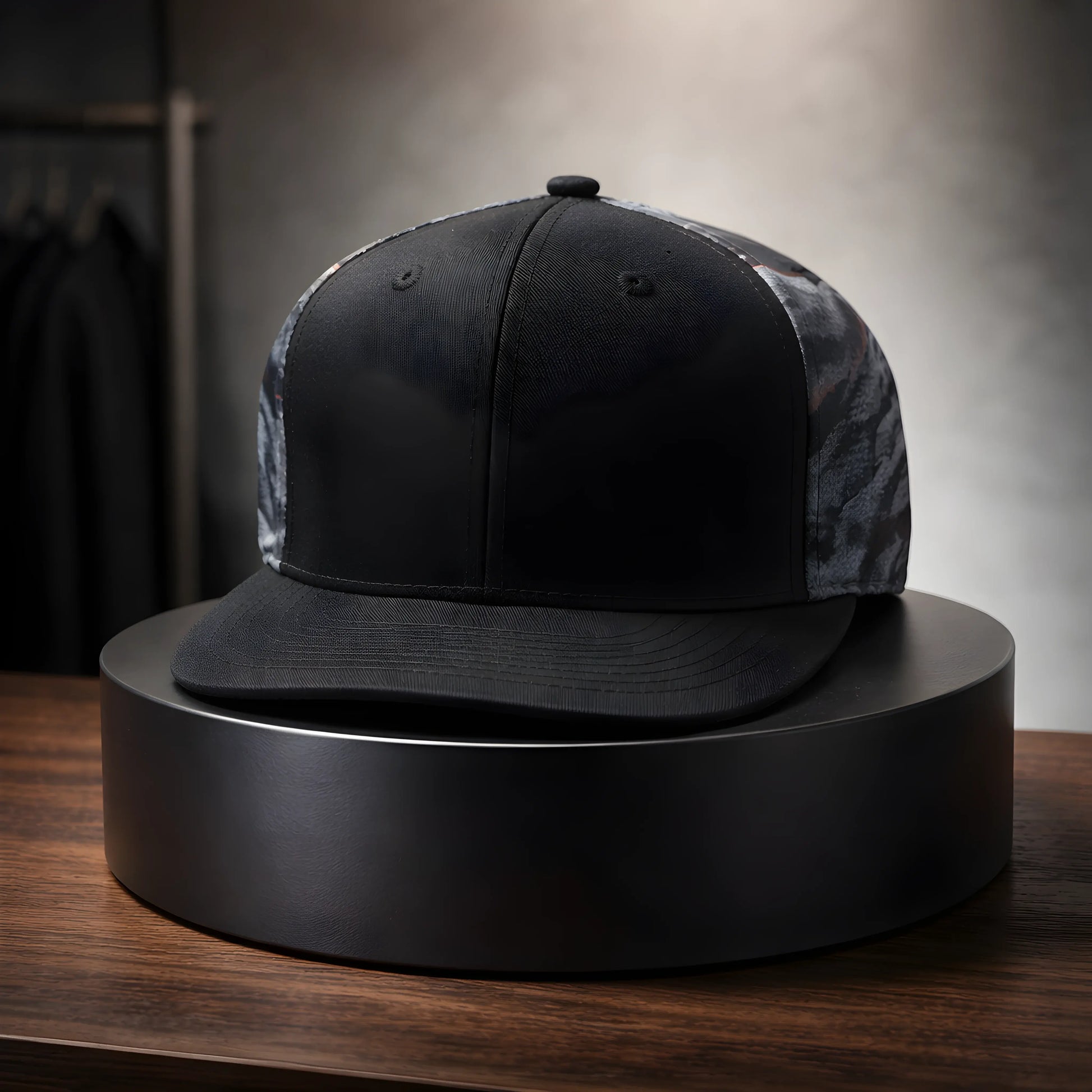 Elevate your streetwear with this modern, two-tone snapback cap. It features solid black front panels for a clean, minimalist look, while the side and back panels are adorned with a dark grey and black camouflage pattern, adding a subtle urban edge. Finished with a classic flat black brim and a structured crown, this versatile accessory offers a bold silhouette that pairs effortlessly with any casual outfit.