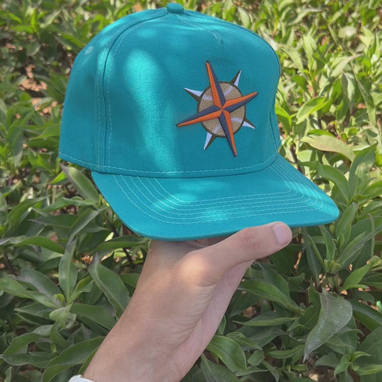 Sleek teal cap featuring an embroidered compass design in orange, white, and grey tones. Perfect for adventurers and travel enthusiasts, it combines a bold color with a symbol of exploration for a stylish, outdoorsy look.