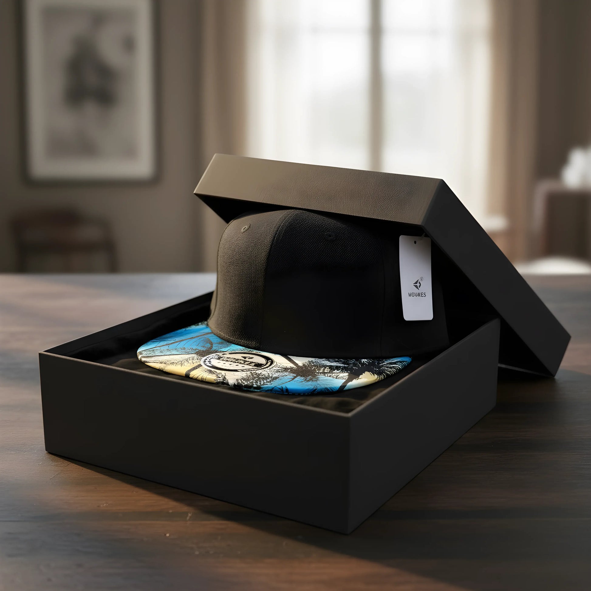 A stylish black snapback cap featuring a bold tropical-patterned flat visor in vibrant blue and sandy tones. Designed with a clean, structured crown and a modern streetwear look, this cap stands out with its eye-catching print and premium finish. Perfect for casual outfits, summer vibes, and urban fashion lovers. Adjustable snap closure ensures a comfortable and secure fit for everyday wear.