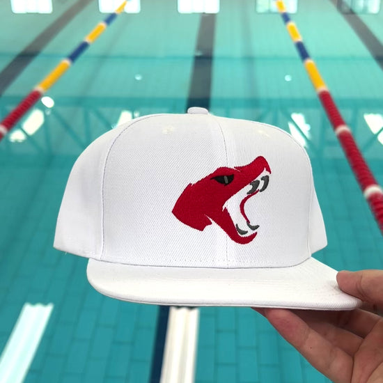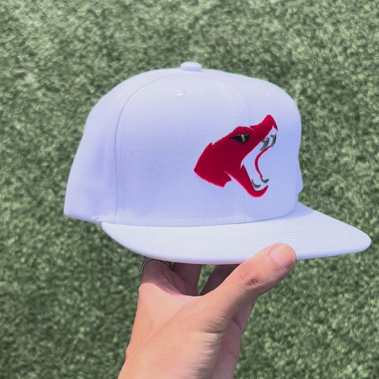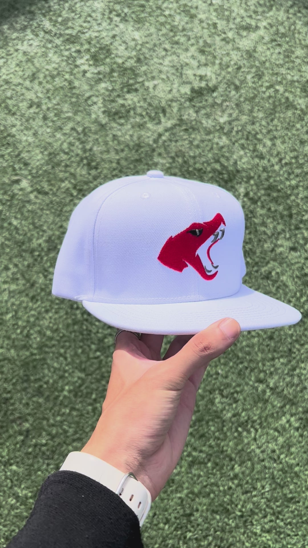 A stylish white snapback cap featuring a bold red wolf head logo with black and white detailing. The cap has a flat brim and structured crown, perfect for casual wear or sports events. The fierce wolf design adds a dynamic and energetic touch, making it a standout accessory.