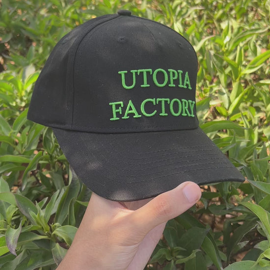 Classic black cap featuring bold green embroidered "UTOPIA FACTORY" text on the front. The vibrant lettering contrasts sharply against the dark fabric, creating a striking, streetwear-inspired look that’s perfect for everyday wear or making a statement.